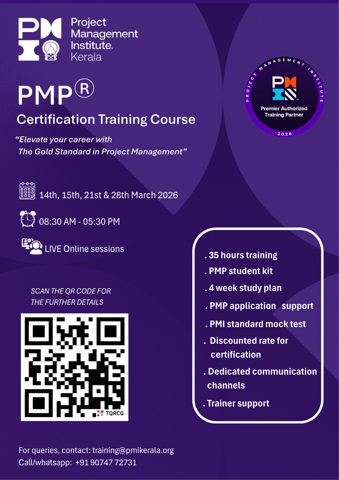 Contact: administrator@pmikerala.org, whats app/call +91 90747 72731