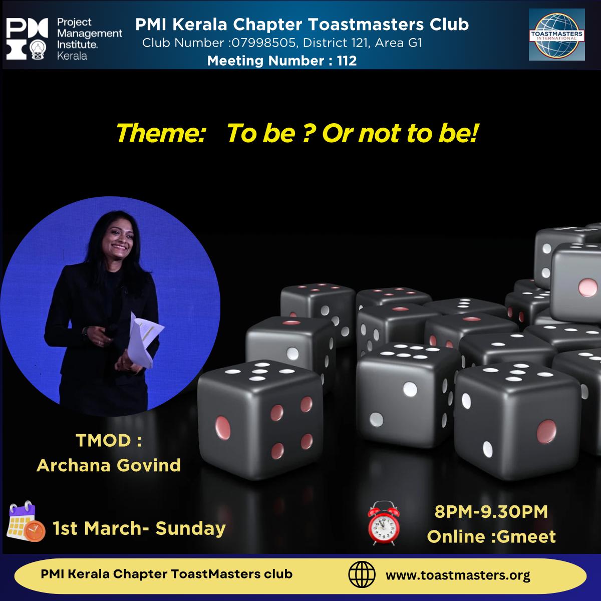 The PMI Kerala Chapter Toastmasters Club Meeting #112 is scheduled to be held on 1st March as an engaging online session via Google Meet. All PMI Kerala members are warmly invited to participate in this enriching learning experience.